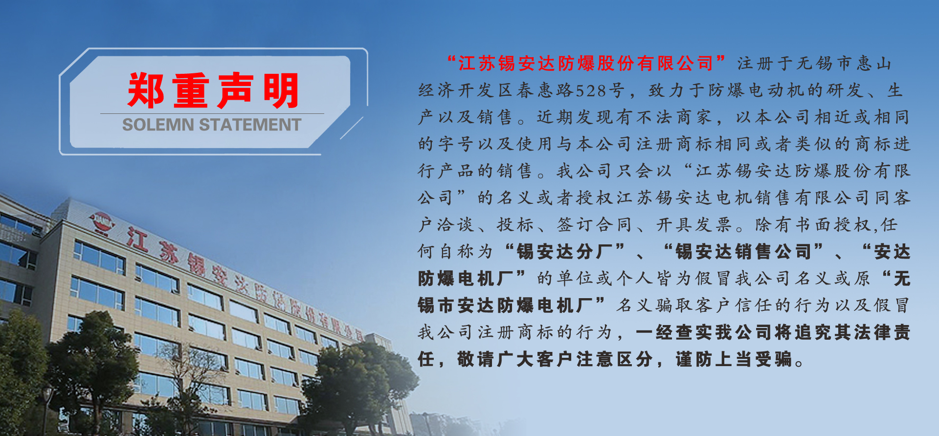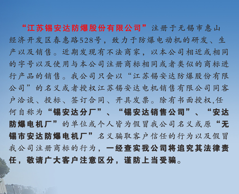 江蘇錫安達防爆股份有限公司由無錫市安達防爆電機廠和江蘇安達防爆機電集團有限公司組建而成,從1986年起開始生產防爆電機,是首批獲得全國工業(yè)產品生產許可證的防爆電機企業(yè)。